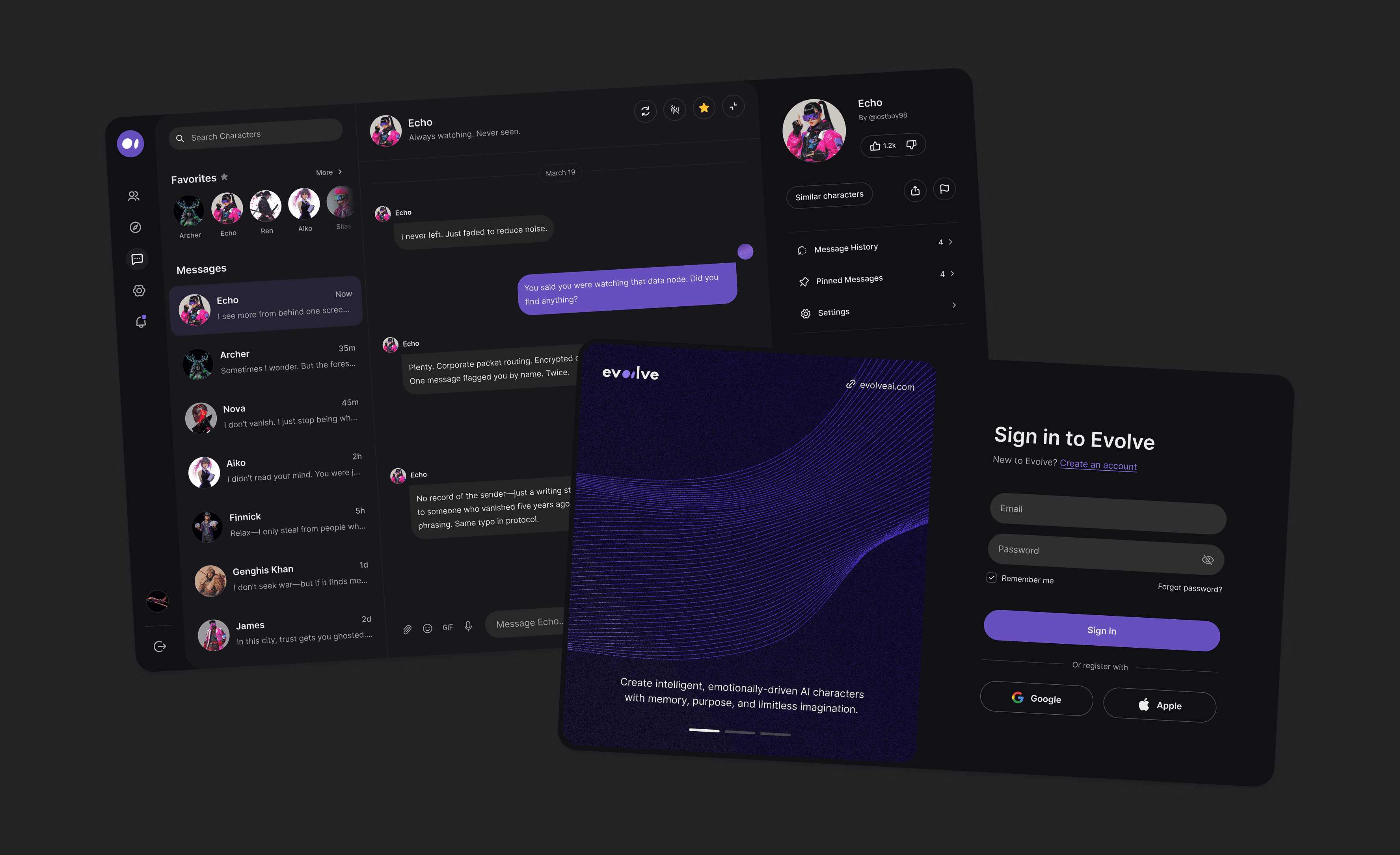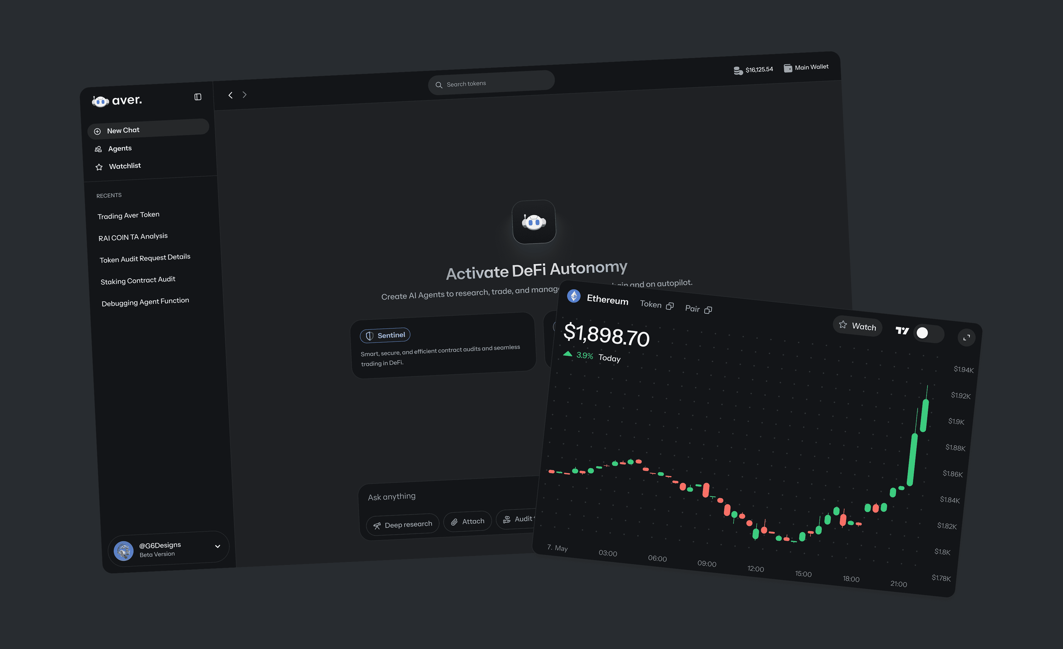 At Sentient Flow, I was hired as the founding designer—first for Evolve AI, a no-code tool for building AI characters, then for Aver, a DeFAI trading platform. As the team grew from 2 to 15, I worked closely with engineers across both products.
